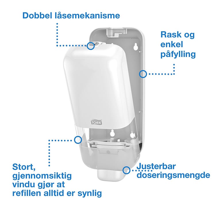 Tork Dispenser for såpe og hånddesinfeksjon passer inn overalt og kan brukes med et stort utvalg av såper, desinfeksjonsmidler og kremer fra Tork i hygienisk forseglede flasker. Den gir pålitelig utmating, har justerbar dosering, er sertifisert «Easy to use» og sørger for god håndhygiene for alle brukere. Denne allsidige dispenseren for såpe og hånddesinfeksjon har et funksjonelt og moderne design som gir gjestene et godt inntrykk.