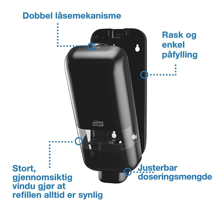Tork Dispenser for såpe og hånddesinfeksjon passer inn overalt og kan brukes med et stort utvalg av såper, desinfeksjonsmidler og kremer fra Tork i hygienisk forseglede flasker. Den gir pålitelig utmating, har justerbar dosering, er sertifisert «Easy to use» og sørger for god håndhygiene for alle brukere. Denne allsidige dispenseren for såpe og hånddesinfeksjon har et funksjonelt og moderne design som gir gjestene et godt inntrykk.