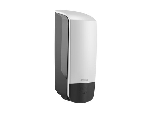 Dispenser med universell utforming og punktskrift på pushknappen. Passer til 1000 ml flasker med flytende håndsåpe, skumsåpe, hår -og kroppssåpe og hånddesinfeksjon.