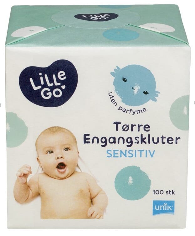 LilleGo' tørre engangskluter brukes til vask og stell av barnet. Uten klor og parfyme. 100 stk.
