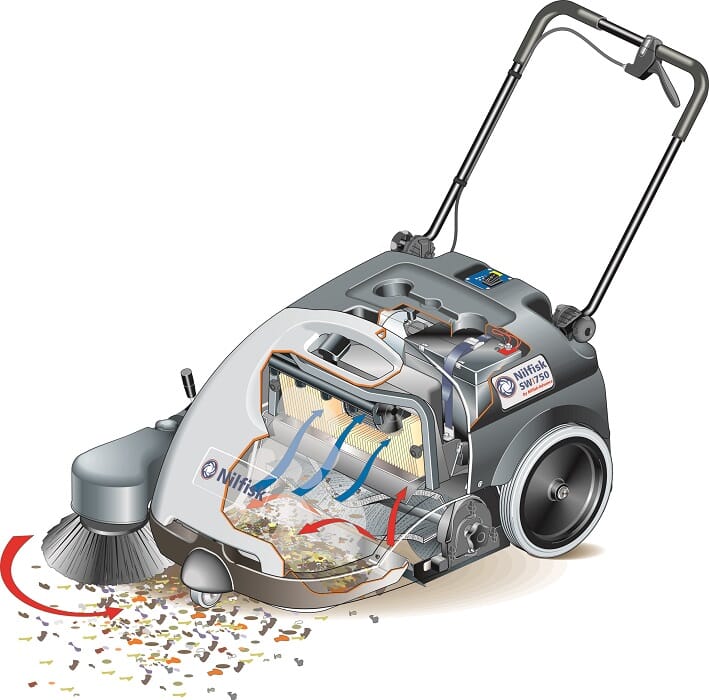Batteridrevet feie-/sugemaskin med kjøremotor til lette rengjøringsoppgaver. Betjening er så enkel at brukeren kan betjene den uten opplæring. Innebygget lader og polyesterfilter medfølger.