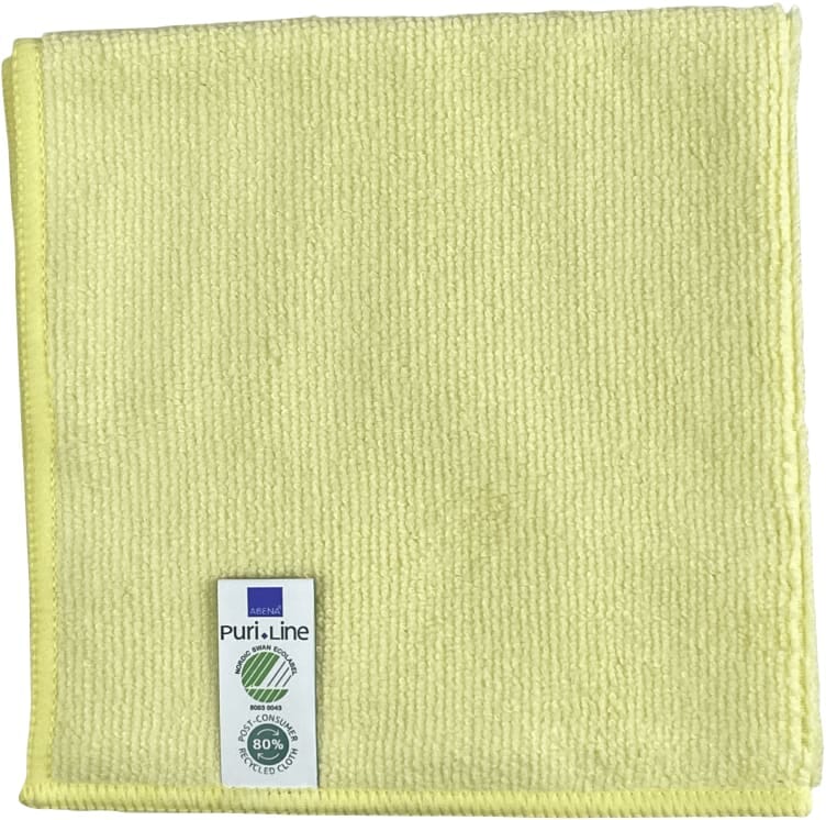 Svanemerket gul mikrofiberklut med 80% resirkulert materiale. Tåler opp til 500 vask. Fjerner 99% av bakterier. Kan brukes tørr og fuktig på alle overflater som tåler vann.
