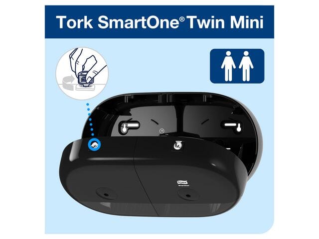 Tork SmartOne Twin Mini Toalettrull Dispenser i Elevation Design er et effektivt og svært robust dispensersystem som passer for krevende toalettrom med høy trafikk.