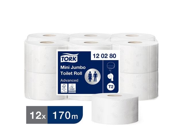 Utstyr toalettet med myke og slitesterke Tork Advanced T2 Mini Jumbo toalettrull. Hver rull har 2-lags ark som gjør papiret absorberende og komfortabelt. Dette produktet er egnet for toaletter både hjemme og på offentlige anlegg.