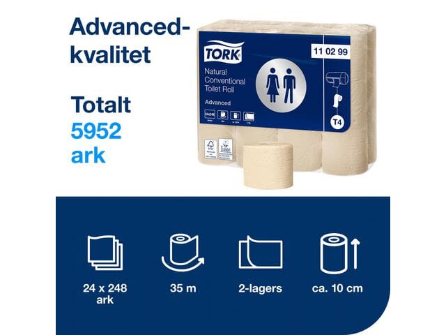 Med Tork Konvensjonell Toalettrull Natur i Advanced-kvalitet kan du gi gjestene dine den samme komforten som de er vant med hjemme. Papiret er laget av 100 % resirkulert papirfiber og har den samme gode papirkvaliteten fra Tork.