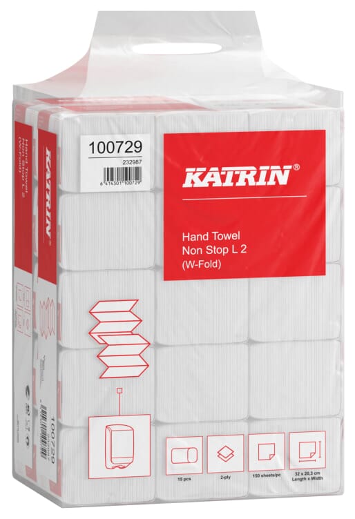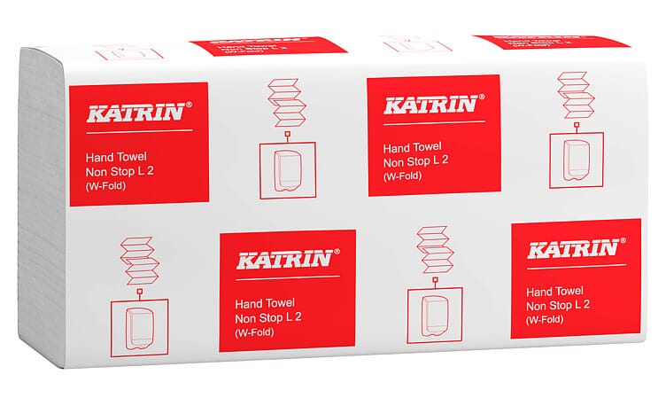 Katrin Non Stop L2 er et 2-lags hvitt mykt håndtørkepapir. Mix nyfiber og resirkulert råvare. God og rask absorpsjonsevne. Kommer som W-foldede ark. Godkjent for kontakt med næringsmidler.
