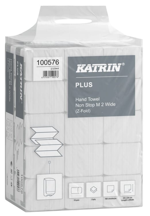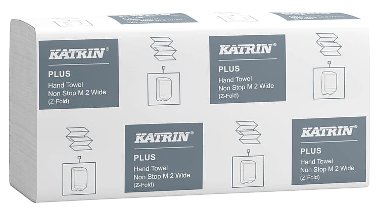 Katrin Plus Non Stop M2 er et bredere 2-lags hvitt, sterkt og mykt håndtørkepapir. 100% nyfiber råvare. Meget høy og rask absorpsjonsevne. Kommer som Z-foldede ark. Godkjent for kontakt med næringsmidler.