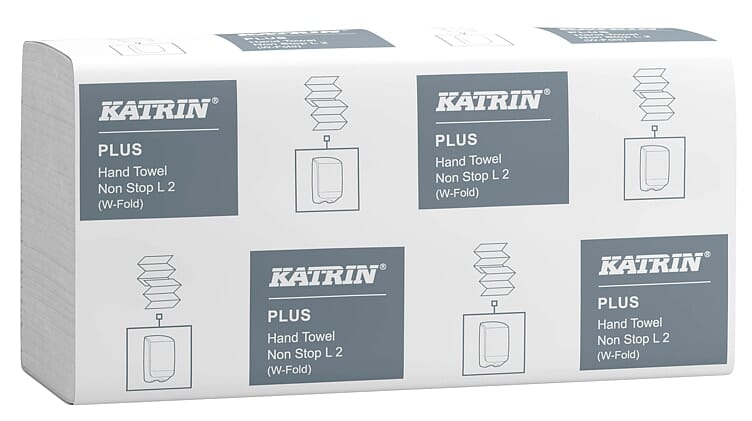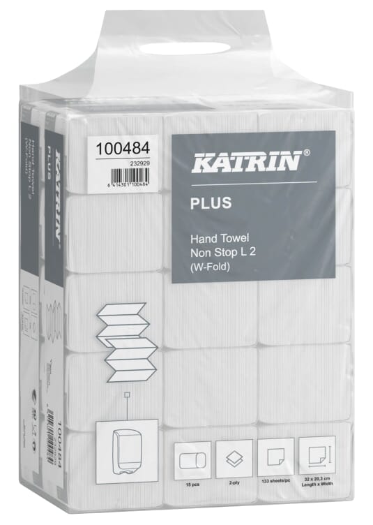 Katrin Plus Non Stop L2 er et 2-lags hvitt mykt håndtørkepapir. 100% nyfiber råvare. Meget god og rask absorpsjonsevne. Kommer som Z-foldede ark. Godkjent for kontakt med næringsmidler. Ark format: lengde 32 cm x bredde 20,3 cm. 133 ark i en pakke og 15 x 133 ark i sekk (1.995). Kommer i hendig sekk med bærehåndtak