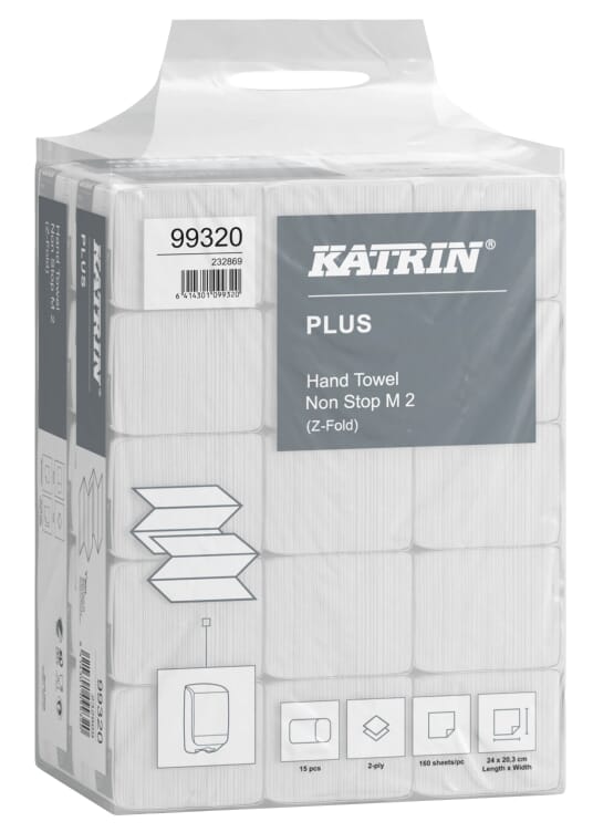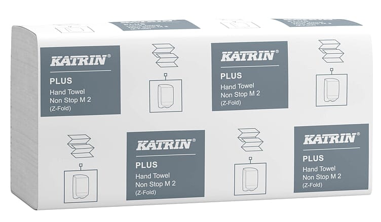 Katrin Plus Z-fold handtowel Non Stop M2 er et kjedefoldet papirhåndkle med svært høy absorpsjon. Myk og sterk 2-lags papirhåndkle som er skånsom mot huden, passer godt på steder hvor hygienekravene er høye. Håndklærne mates ut ett om gangen og tørker hendene raskt, noe som gir trygg hygiene, kontrollert forbruk og krever mindre tid til etterfylling. Kan komme i direkte kontakt med næringsmidler i kort tid. Leveres i en smart pakke med ergonomisk grep, som gjør det enkelt å bære og håndtere produktet. Passer i alle Katrins håndkledispensere, velg dispenserløsning etter besøksfrekvens.