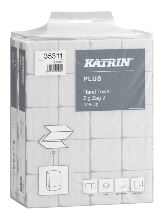 Katrin Plus V-fold papirhåndkle Zig Zag 2 er et falset papirhåndkle med svært høy absorpsjon. 2-lags håndkle som gir kontrollert forbruk og mindre tid til etterfylling.