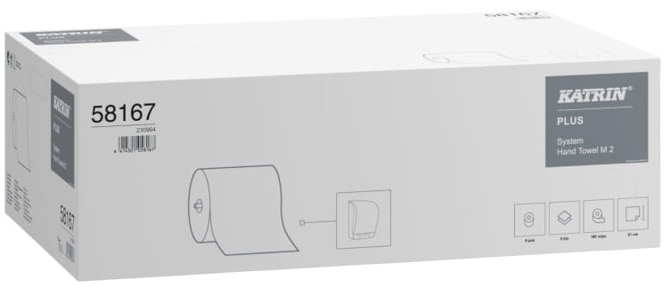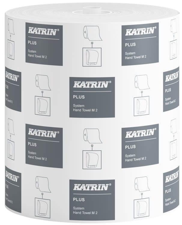 Katrin Plus System Towel er en hvit tørkerull med 635 ark, som er skånsom mot huden og har høy absorpsjonsevne. Kontrollert forbruk, dispenser mater frem ett ark av gangen.