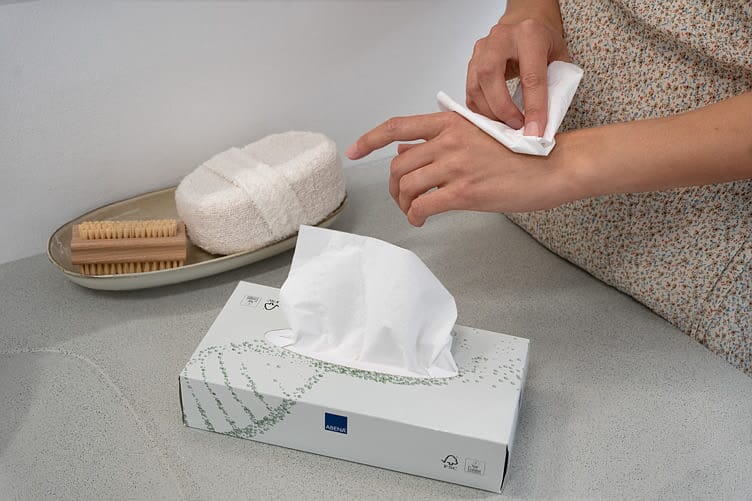 Ansiktsserviett i en praktisk eske med ett-ark-av gangen funksjon.2-lags myk serviett. Servietten er av nyfiber. 100 ark pr. pk.