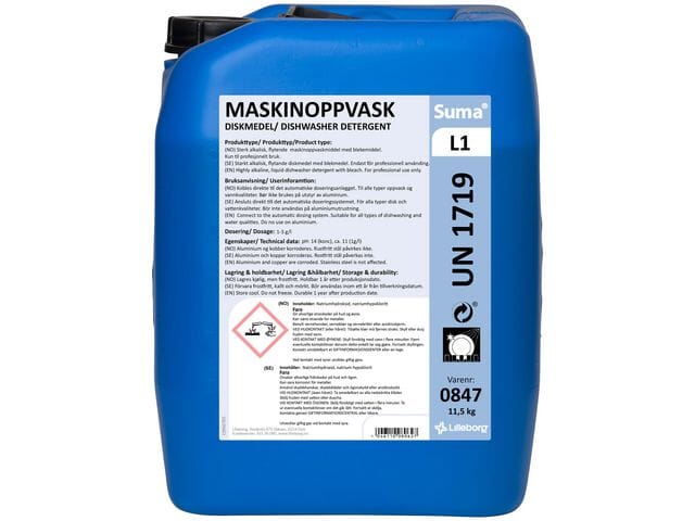 Et sterkt alkalisk, flytende maskinoppvaskmiddel med blekemiddel.