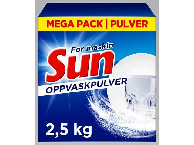 Sun Maskinoppvaskpulver med ny formulering og i en plasseffektiv 2,5 kg eske for ekstra mange runder i oppvaskmaskinen.