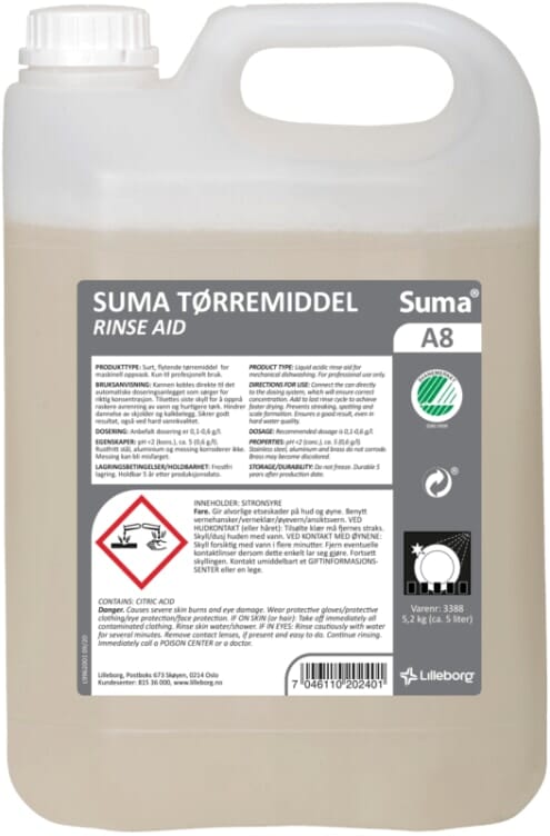 Svanemerket flytende tørremiddel til alle typer oppvask. Produktet er surt og spesielt egnet for hardt vann. Fargen blå ble tatt ut av formuleringen på Suma Tørremiddel A8 i april 2021. Lilleborg jobber aktivt med substitusjon og vurderer innhold opp mot miljø, effektivitet, funksjon og kvalitet.