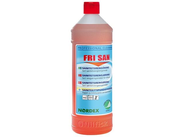 Med dette Nordex Fri San-rengjøringsmiddelet får du styrken til et profesjonelt, universalt rengjøringsmiddel i ditt eget hjem. Du kan trygt bruke Nordex Fri San Nature hver dag, enten du rengjør sanitærutstyr, fliser eller toalettseter. Dette er et høykonsentrert sanitetsrengjøringsmiddel for rengjøring og avkalking av alle syrebestandige flater som sanitetsgods, fliser og rustfritt. Fare- og sikkerhetsinformasjon: H318 Gir alvorlig øyeskade. - Gi flatene polish og glans igjen uten å risikere skade på finishen - Bør ikke brukes på marmor eller andre syrefølsomme flater - Volum: 1 liter - PH: 2